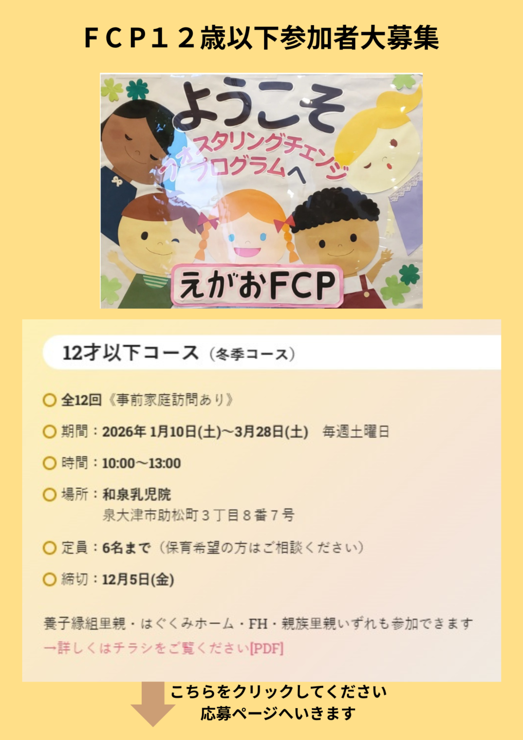 お知らせ 2025年11月13日 FCP12歳以下 参加者大募集! フォスタリングチェンジ・プログラムのお申し込み | NPO法人 里親子支援機関 えがお ↓ フォスタリングチェンジとは (・・? フォスタリングチェンジ・プログラム | NPO法人 里親子支援機関 えがお
